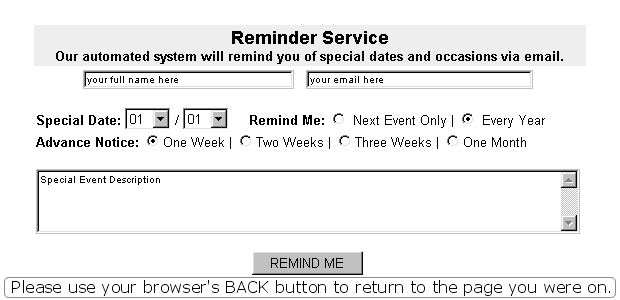 The Gift Reminder Service is a feature intended to remind your customers of their important dates, such as birthdays, anniversaries, holidays, etc. Once the customer has added their important dates, an email notification is sent from your store to provide a reminder of the upcoming event and also link to your online store. This feature works well for online stores that specialize in gifts and/or provide gift delivery options to their customers.